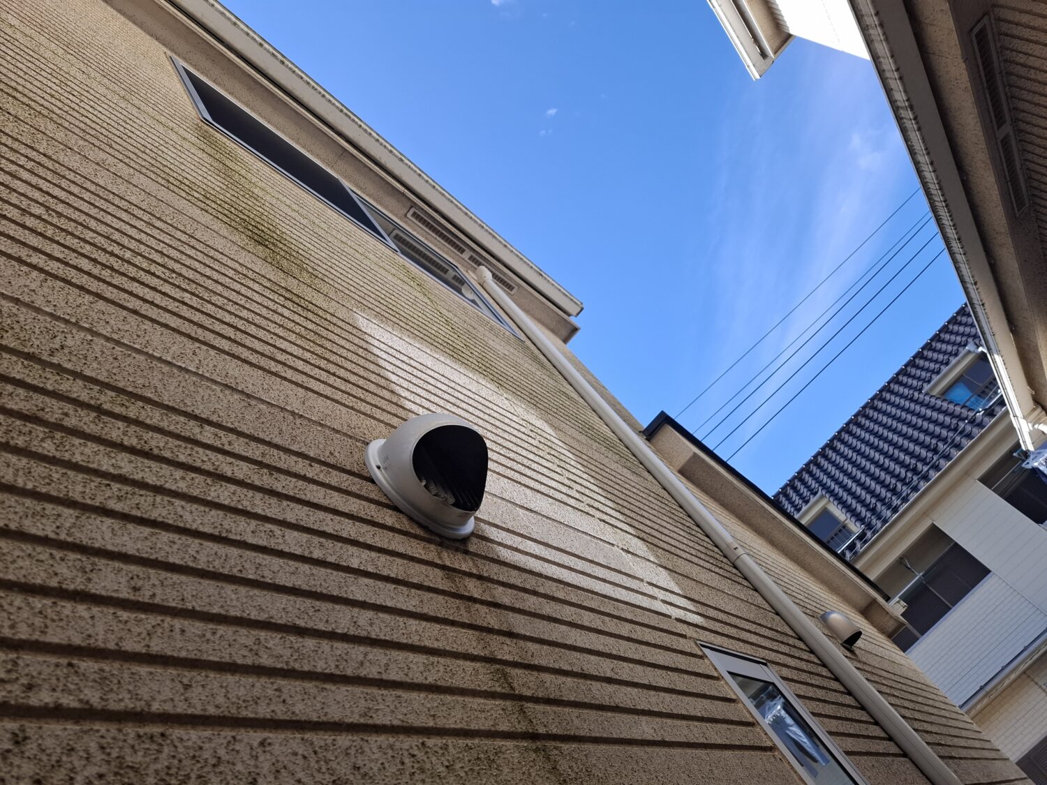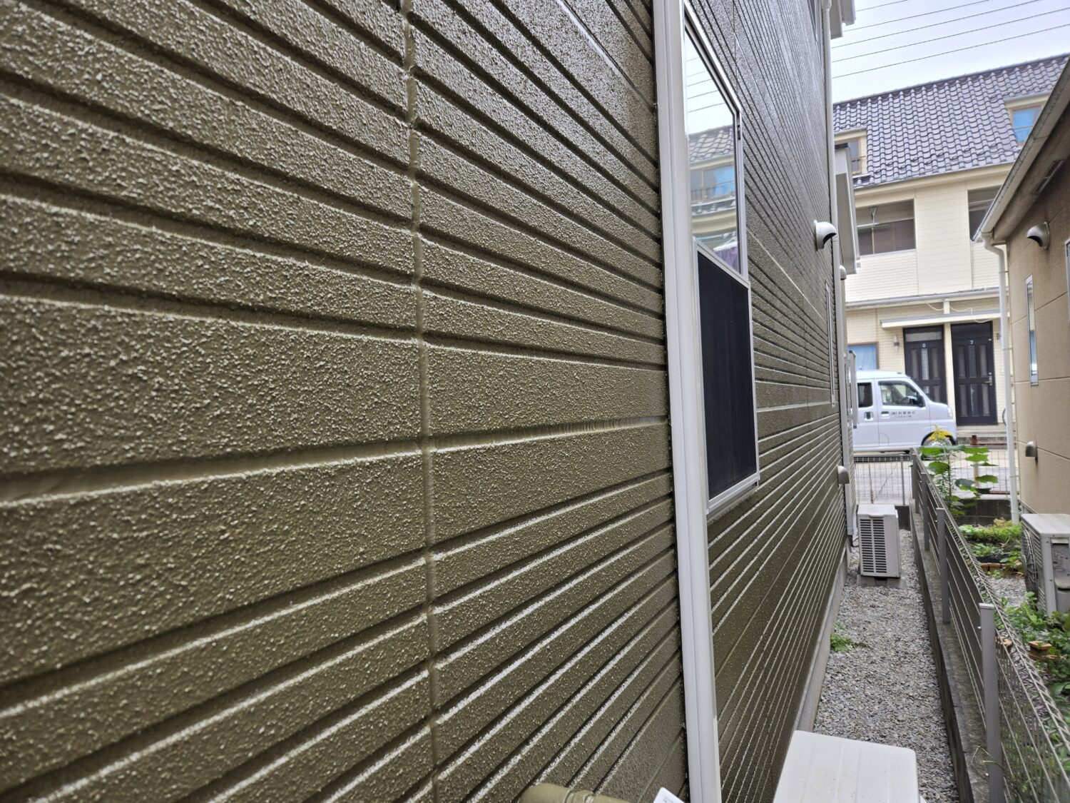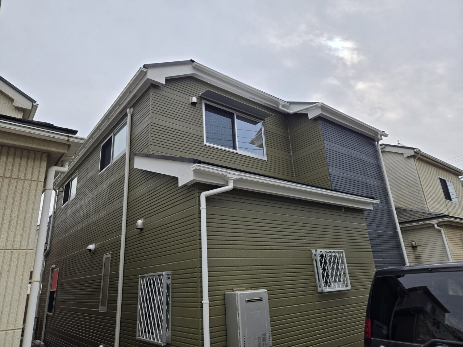 2回塗りで仕上げました。破風板.雨樋.水切り等はクインマイルドシリコンで仕上げ