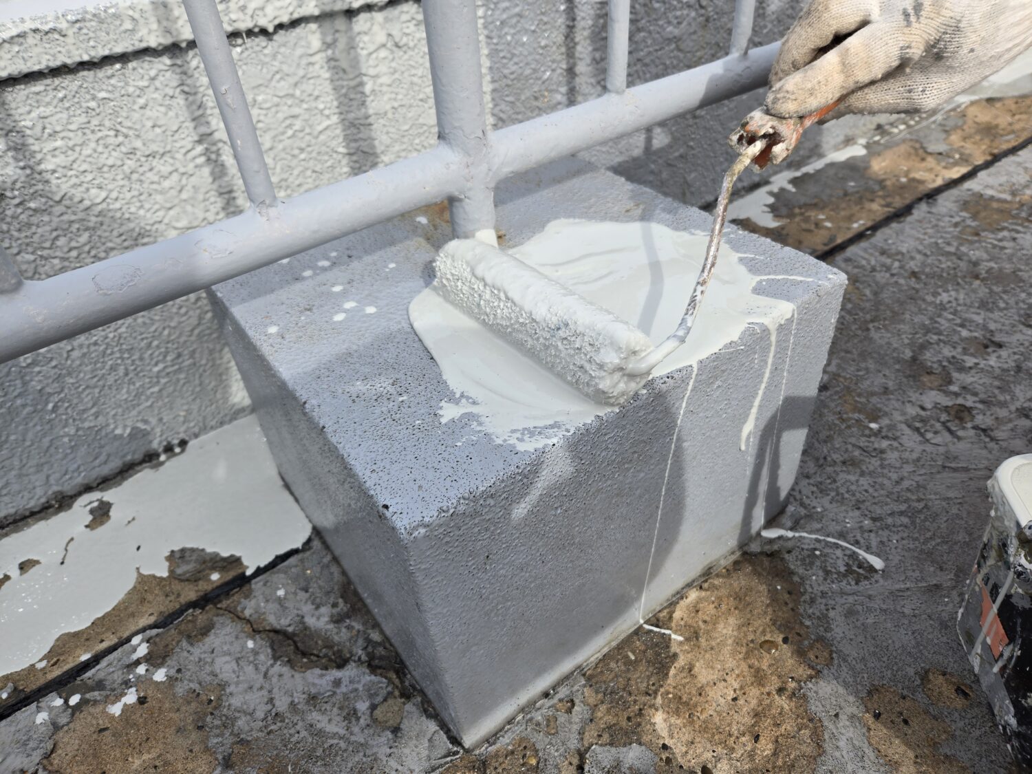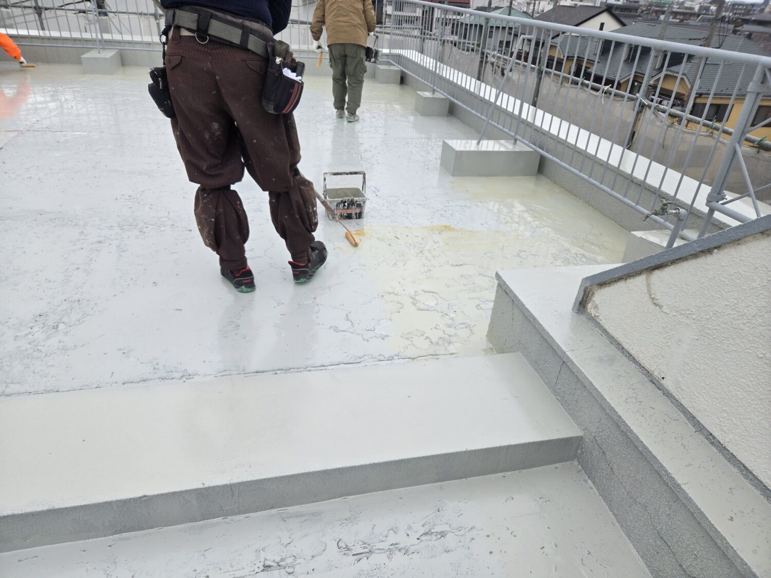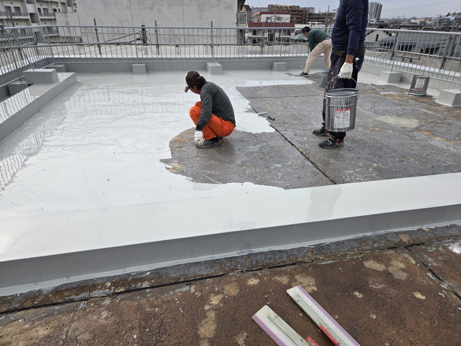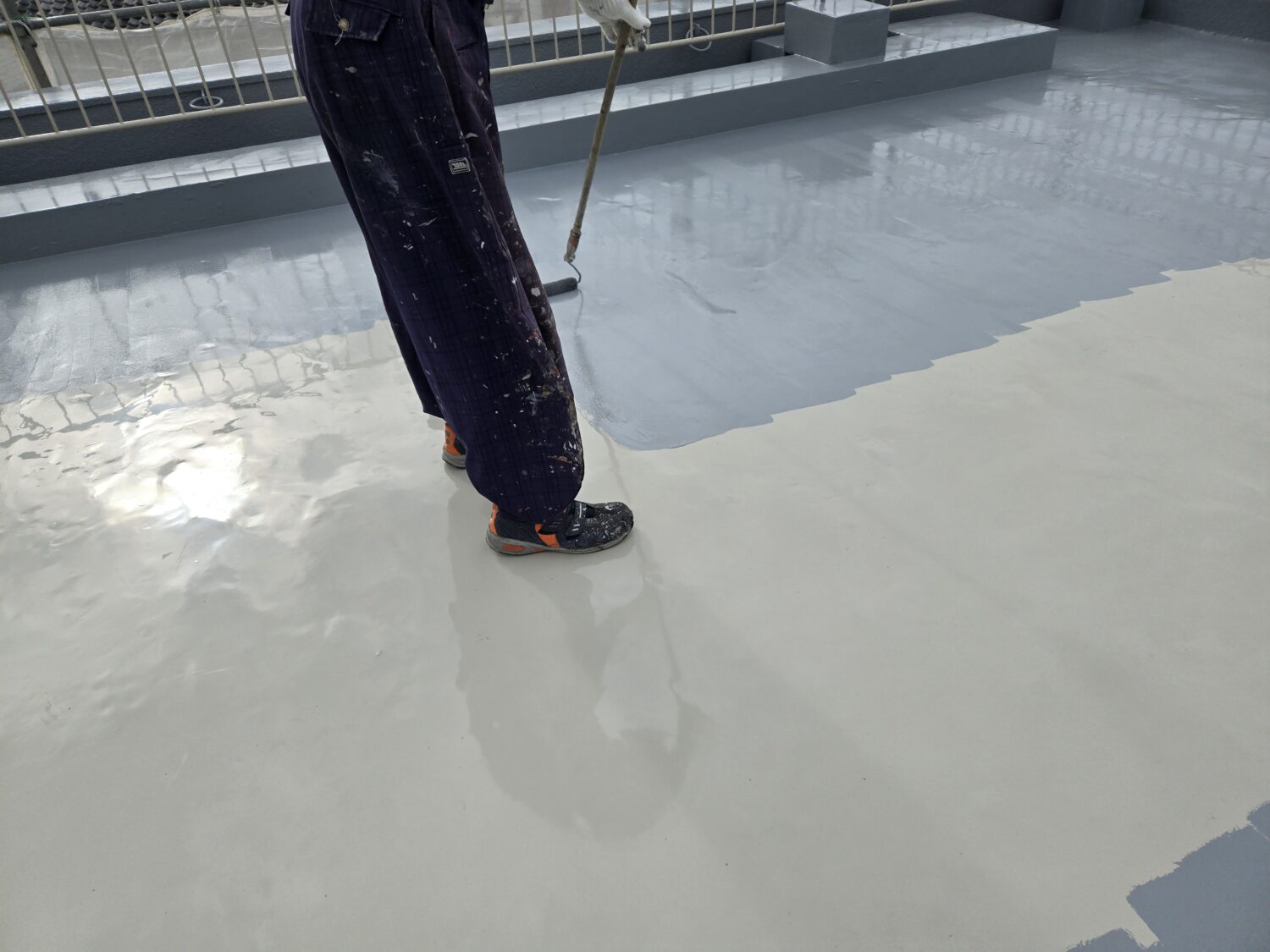 屋上ウレタン塗膜脱気工法 全面プライマー塗布後立上り部ウレタン塗布