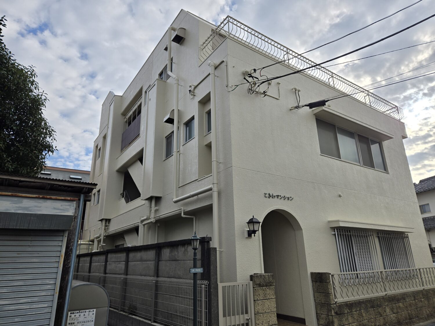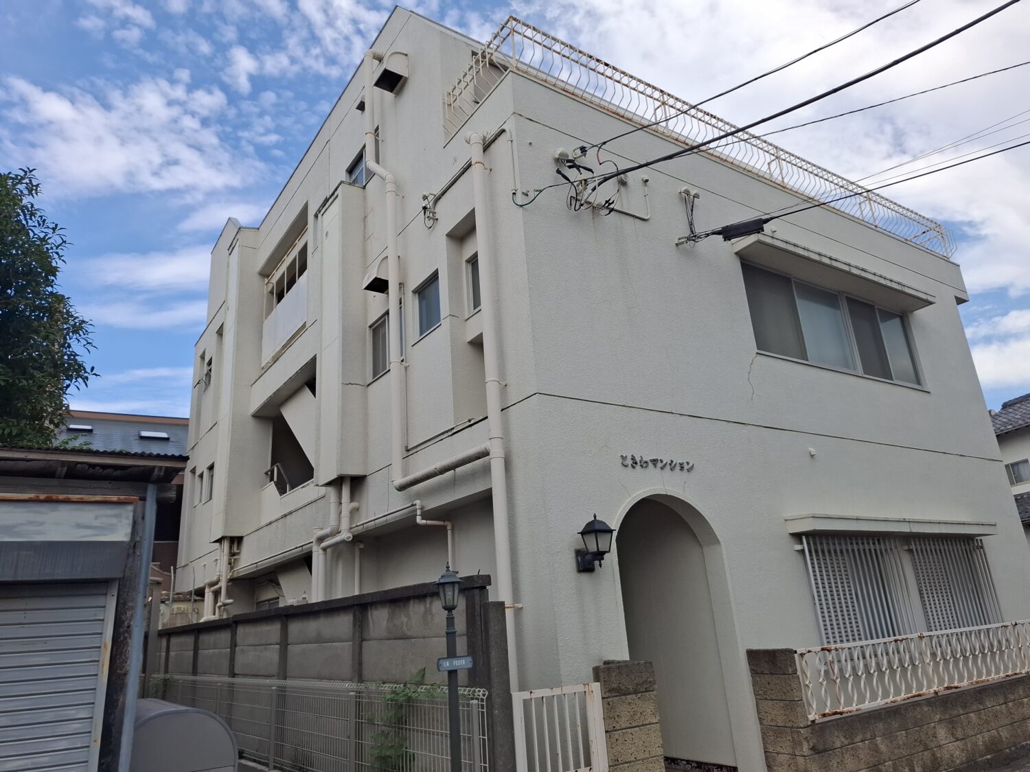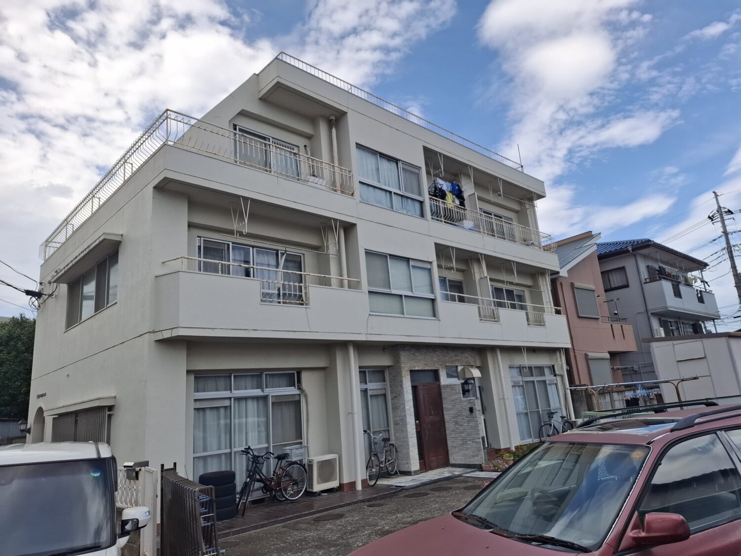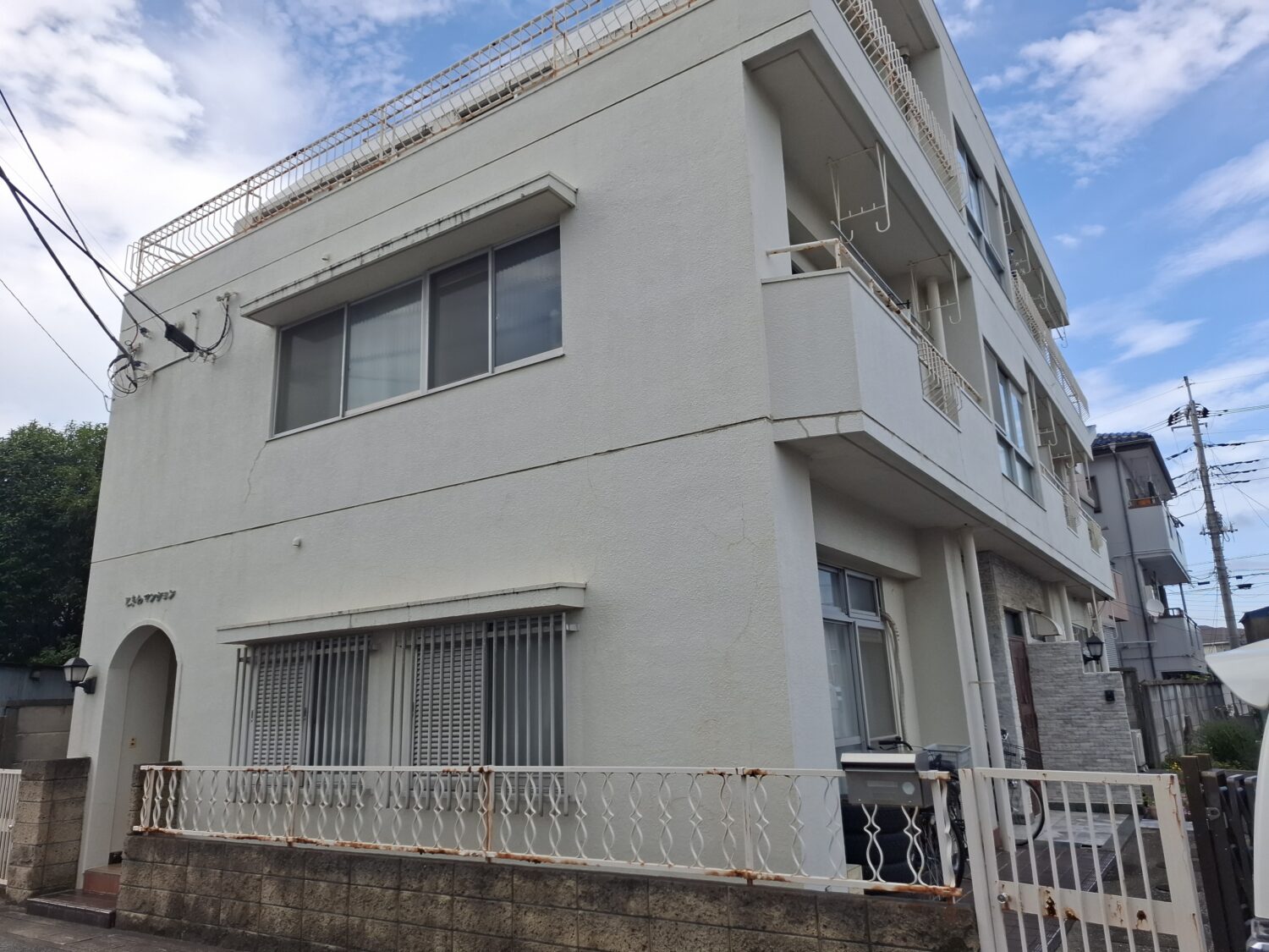 松戸市 Tマンション外部改装工事 モルタル+吹付リシン状に水性シリコン 屋上防水工事 等